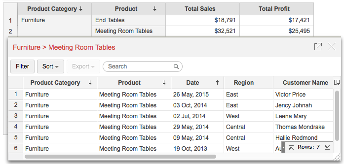 Zoho Analytics enables you to view the data that makes up the Summary View. You can click on any cell in the Summary View to view its underlying data in a pop up table. You can also view the overall data by right clicking the column header and selecting View Underlying Data option or by clicking the Underlying Data button in the toolbar (View Mode).