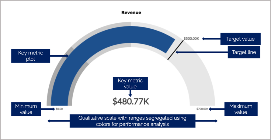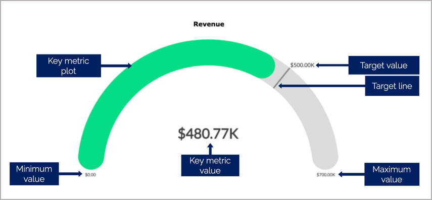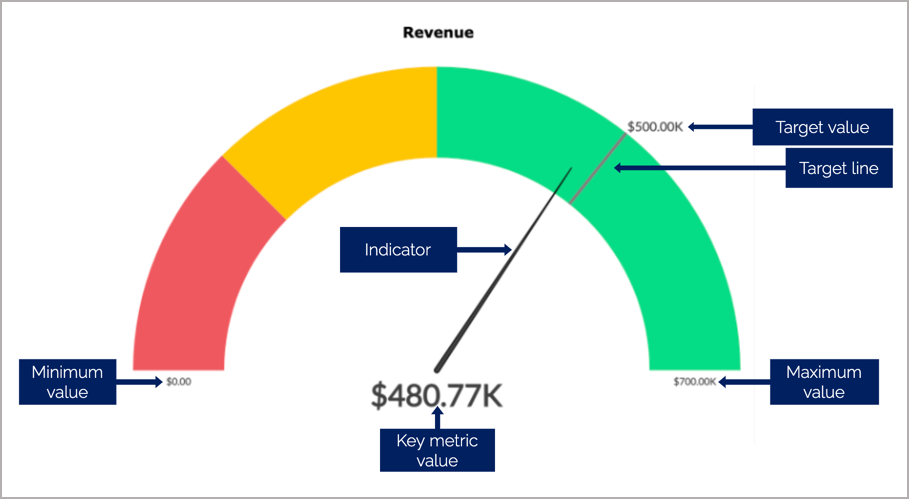Speedometer: The speedometer is a dial chart with an indicator that marks the position of the key metric value in a given range. By default, the qualitative ranges in the speedometer don't follow the same hues. The red, yellow, and green colors prove beneficial in indicating your performance range.