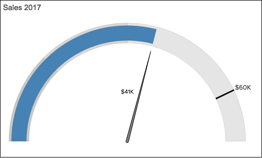 A Dial chart is used to indicate the current value of a metric in a given range. Although similar to a bullet chart, it displays the values in the form of a semi-dial. You can also specify qualitative ranges of performance using dial charts.