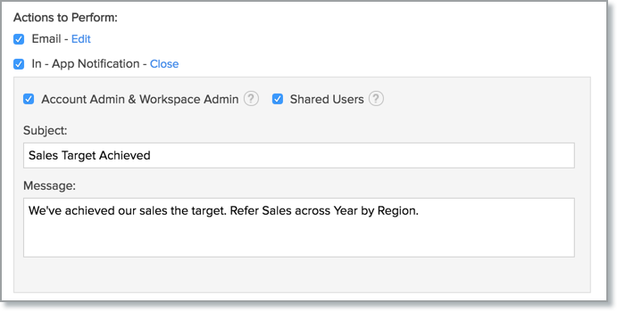 If you select In - App Notification option, you can choose to send the data alert to the administrators and the workspace admin, and also the shared users of the report. You can also modify the notification's subject and message as required.