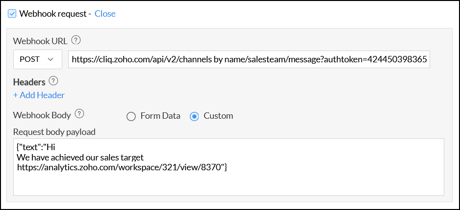 Custom: Enter the required message in the Request body payload section in the following format: {"text":"<your message>"}