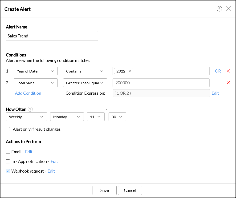 The Actions to Perform section allows you to choose how you wish to be notified when the data alert conditions are met. You can choose to be notified by email, through in-app notifications or configure a webhook request.