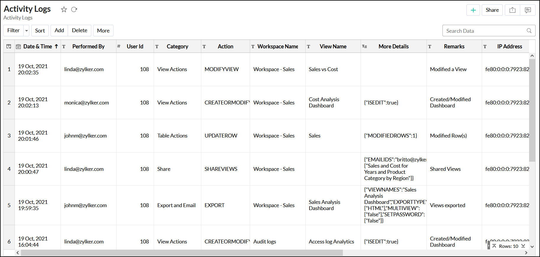 Activity logs enable you to capture the various user activities or actions performed in Zoho Analytics, such as data import, report creation, and more.