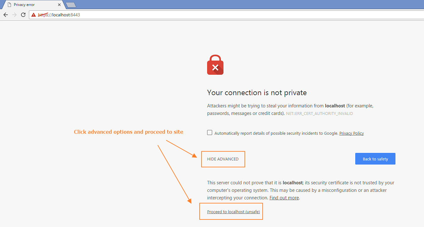 The Zoho Analytics web-client can be accessed only over an HTTPS connection. Your browser may issue a security warning when you access the application due to a self-signed certificate. It is perfectly safe to bypass the security warnings and access the web-client.