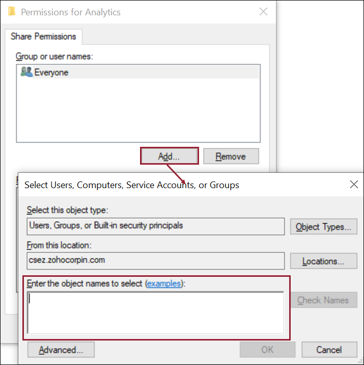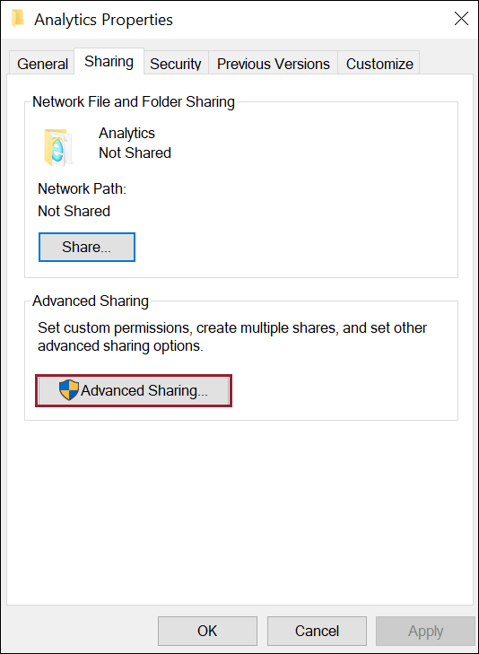 Navigate to the directory where Zoho Analytics is installed, right-click the folder and select the Properties option. Navigate to the Sharing tab and click the Advanced Sharing button.