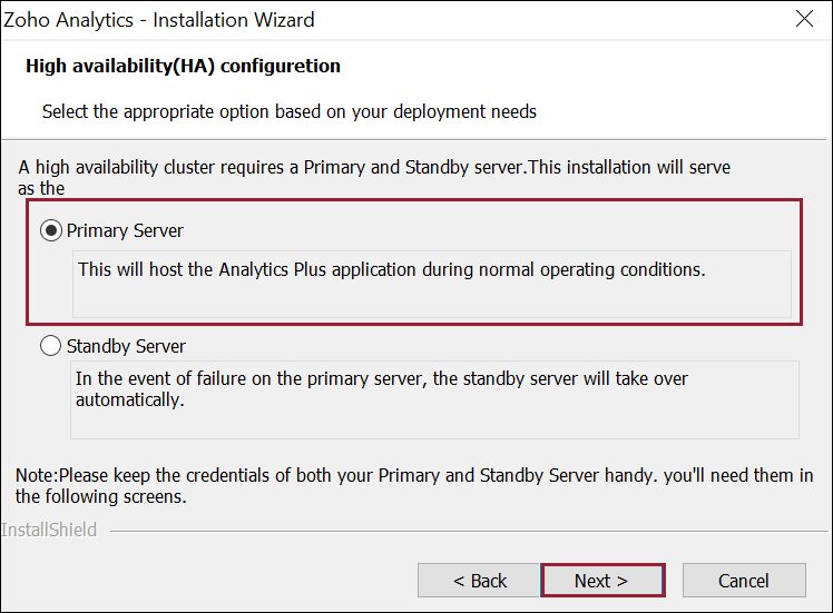 Select the Primary Server radio button in the following screen, and click Next to proceed with the installation process. Upon successful installation, your primary server will be configured.