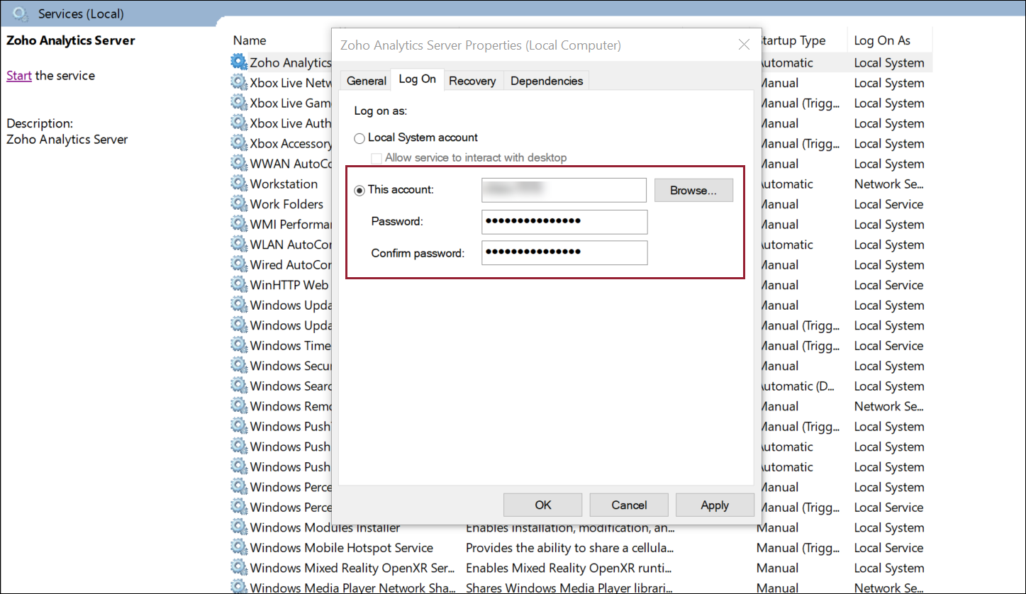 To restart Zoho Analytics with admin privileges, open the Services window and navigate to the Zoho Analytics listing. Right-click on the service name, select the Properties option and head to the Log on tab. Enter your administrator credentials, and click the Apply and OK buttons to reflect the change.
