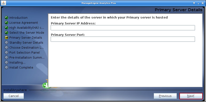 Enter the primary server's static IP address and port number, and click Next to proceed with the installation process.