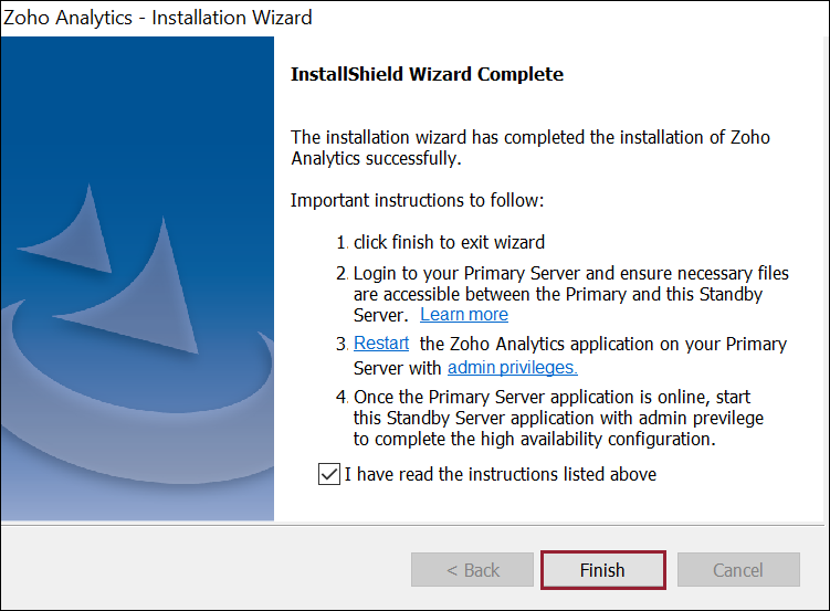 You will now need to configure file sharing between your primary and standby servers to ensure the data in both servers stays up-to-date. Head to your primary server, configure file sharing, and restart the Zoho Analytics application. (To learn more about configuring file sharing, click here.) On successfully configuring file sharing, restart the Zoho Analytics application in your primary server with admin privileges, and when the primary server is online, start the Zoho Analytics application installed in your standby server. (To learn more about restarting the application with admin privileges, click here.)
