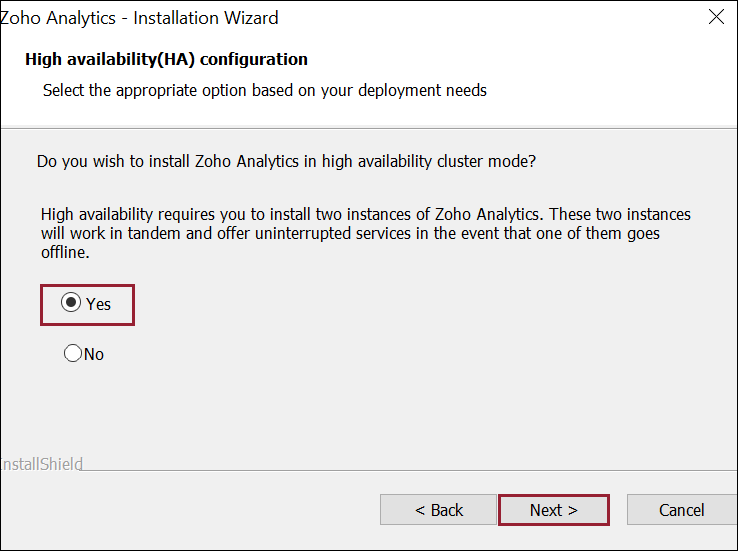 During the Zoho Analytics installation process, select the Yes radio button in the High Availability Configuration screen, and click Next to begin setting up the high availability functionality.