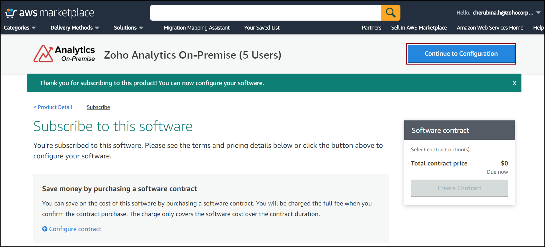 Subscribe to the software by accepting the terms and conditions in the page that appears, and click the Continue to Configuration button.