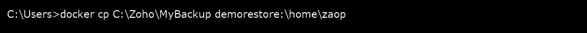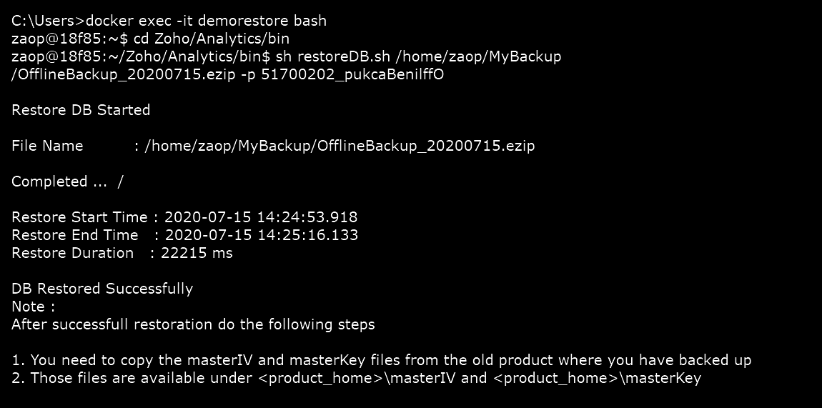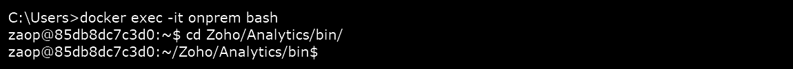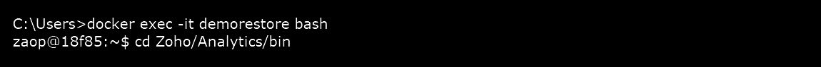 Step 3: Change the directory to Zoho/Analytics/bin and execute the interactive bash shell on the container using the command docker exec -it demorestore bash.