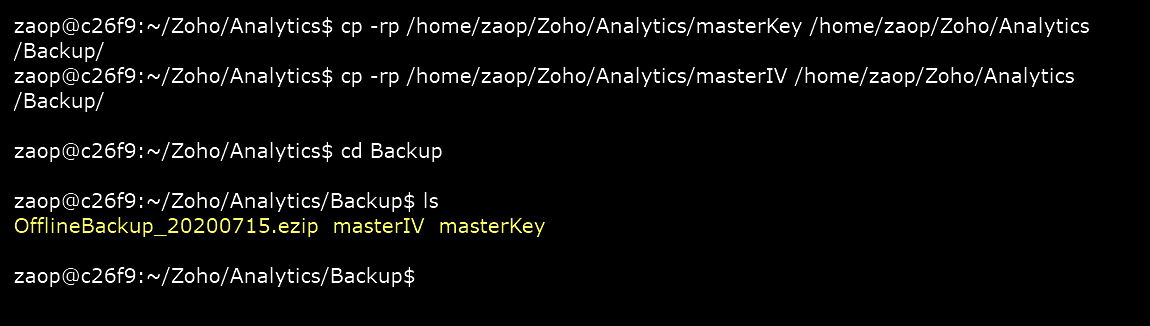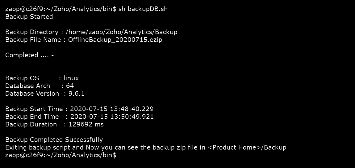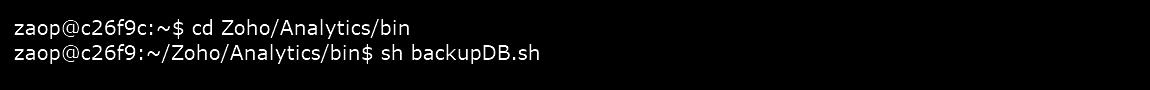 Step 2: To start the backup, change the directory to Zoho/Analytics/bin, and execute this command sh backupDB.sh