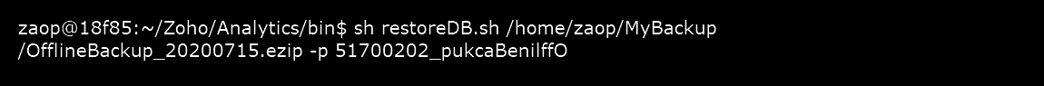 This is how the command would appear: sh restoreDB.sh /home/zaop/MyBackup/OfflineBackup_20200715.ezip -p 51700202_pukcaBenilffO
