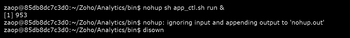Step 8: Start Zoho Analytics On-Premise using the command: nohup sh app_ctl.sh run &. Use the command disown to remove jobs from the job table of the parent shell.