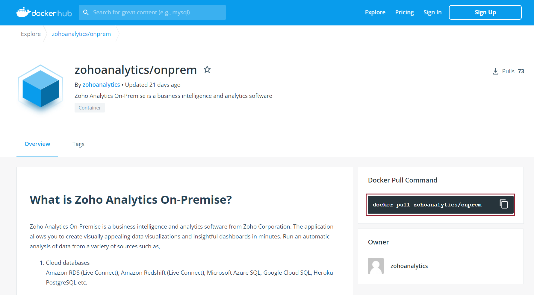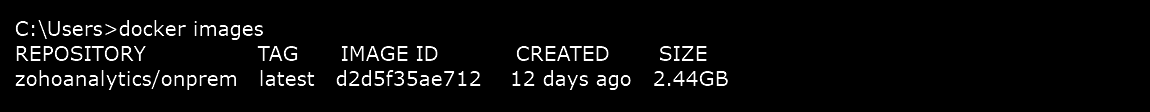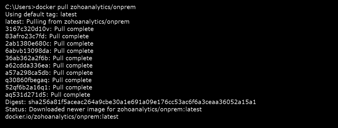 Step 3: Run the copied command docker pull zohoanalytics/onprem to download the docker image.