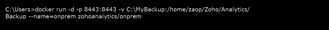 docker run -d -p 8443:8443 -v C:\MyBackup:/home/zaop/Zoho/Analytics/Backup --name=onprem zohoanalytics/onprem