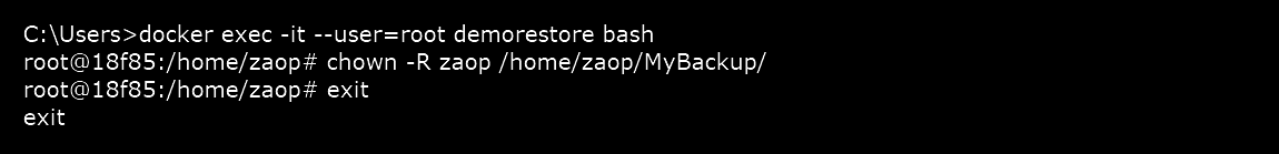 Step 2: Execute an interactive bash shell on the container as a root user using the command docker exec -it --user=root demorestore bash, and change the ownership of your backup folder.