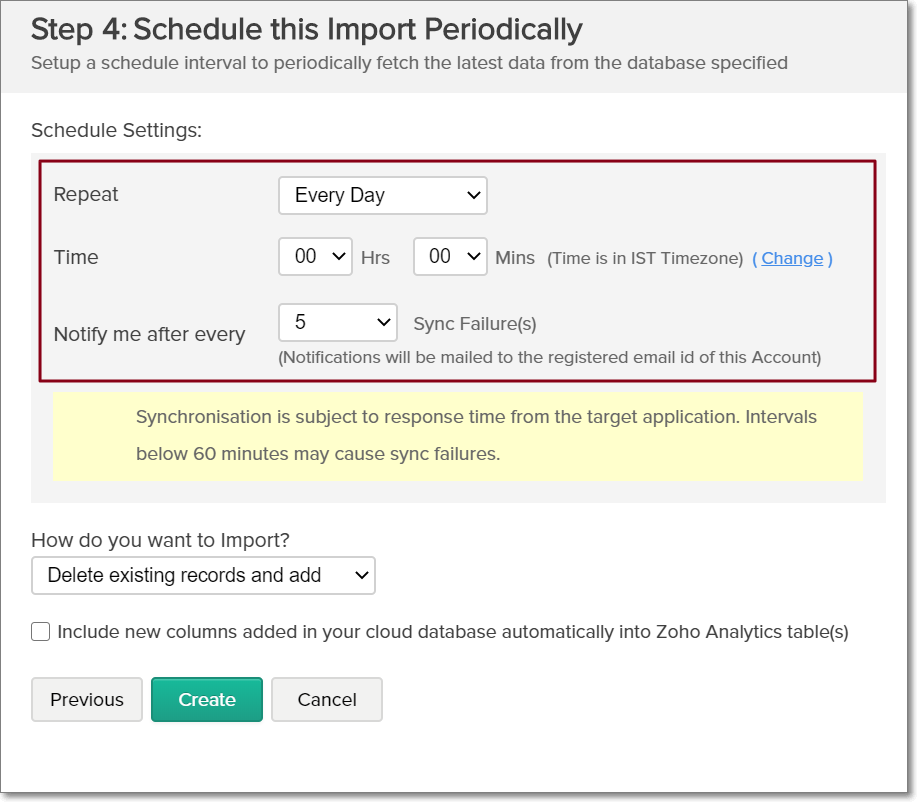 Note: In order to use the Add records at the end option, the source table should be modified in a way that it only displays new rows of data that have been added since the previous synchronization. Please contact onprem-support@zohoanalytics.com to use this option effectively.