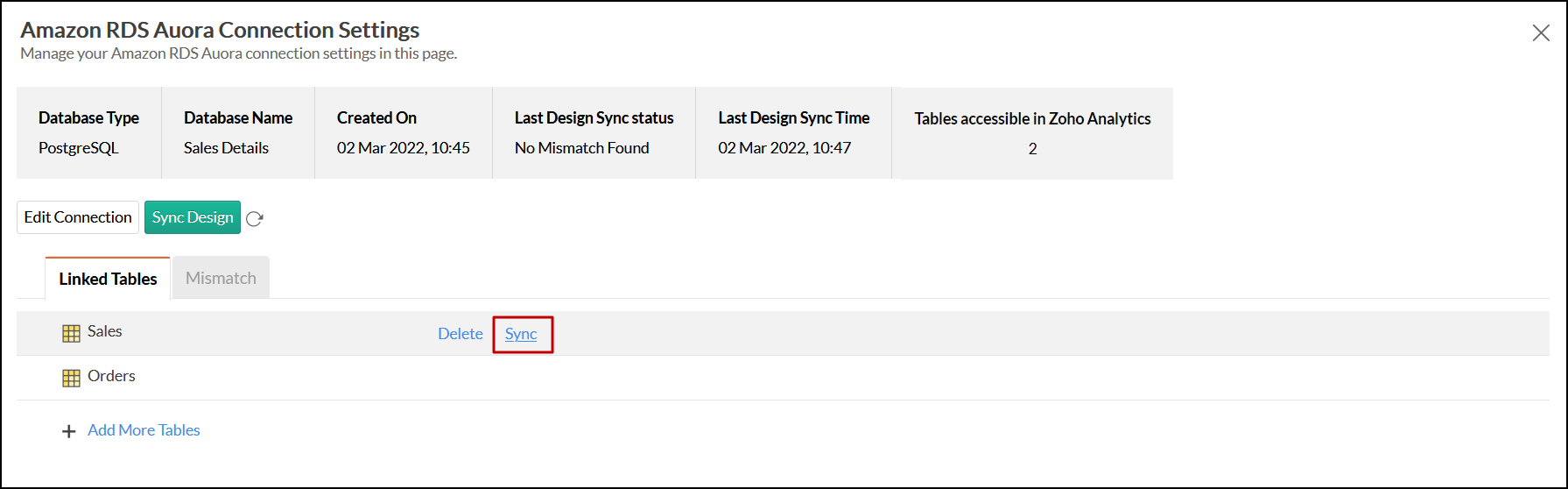 So, ensure that the tables/columns in Zoho Analytics workspace and Amazon RDS Amazon Aurora PostgreSQL database matches. The tables/columns that do not match will be listed in the Mismatch tab of the Amazon RDS ConnectionSettings page. Refer the next question to know more about mismatch.