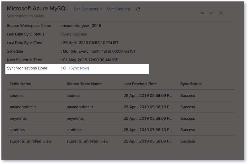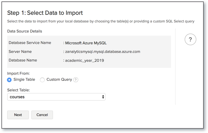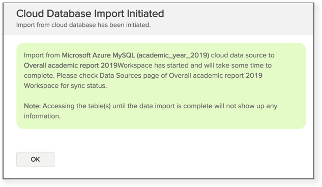After setup, you might have to wait sometime for the initial fetch to happen. This depends upon the amount of data to be imported into Zoho Analytics and also the response time of your Microsoft Azure MySQL server. You will receive an email notification once the import is complete. Please note that, if you access the workspace before the initial fetch, it will not display any data.