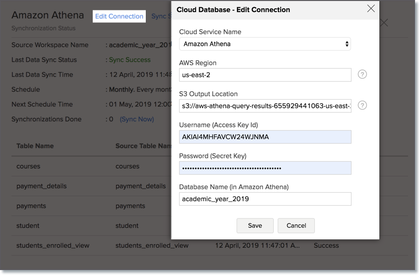 Live Connect: In this mode, data will not be imported and stored in Zoho Analytics. Instead, Zoho Analytics will display live data from your database when reports and dashboards are launched. The report loading time will directly depend on the response and performance of Amazon Athena. Live connections offer the convenience of real-time updates.