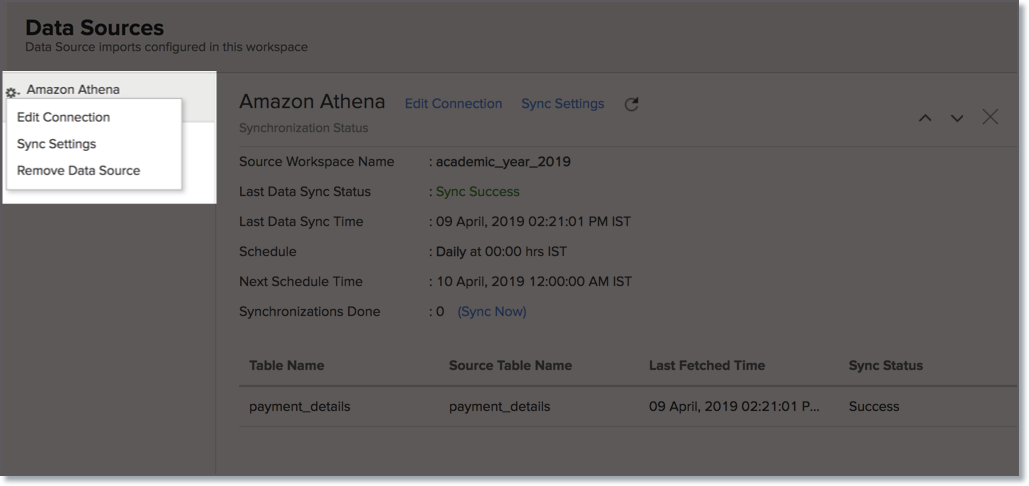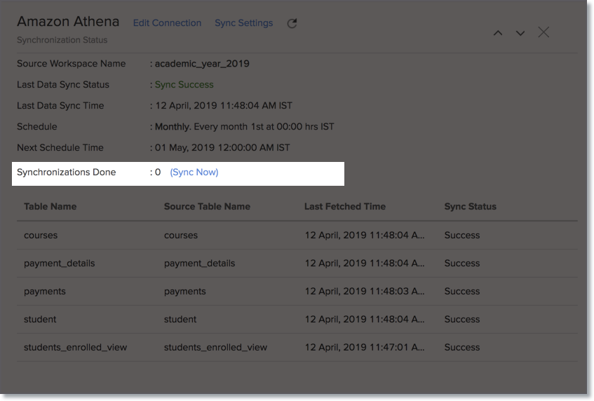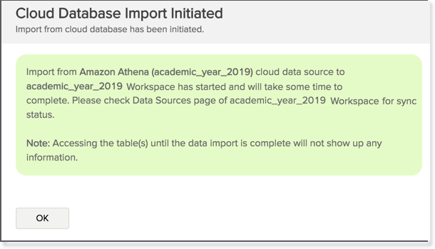 After setup, you might have to wait sometime for the initial fetch to happen. This depends upon the amount of data to be imported into Zoho Analytics and also the response time of your Amazon Athena server. You will receive an email notification once the import is complete. Please note that, if you access the workspace before the initial fetch, it will not display any data.