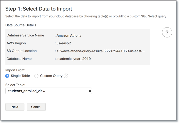 As data from the source database is not imported into Zoho Analytics, the loading time depends on the amount of data stored in your Amazon Athena database, and the performance of the database.