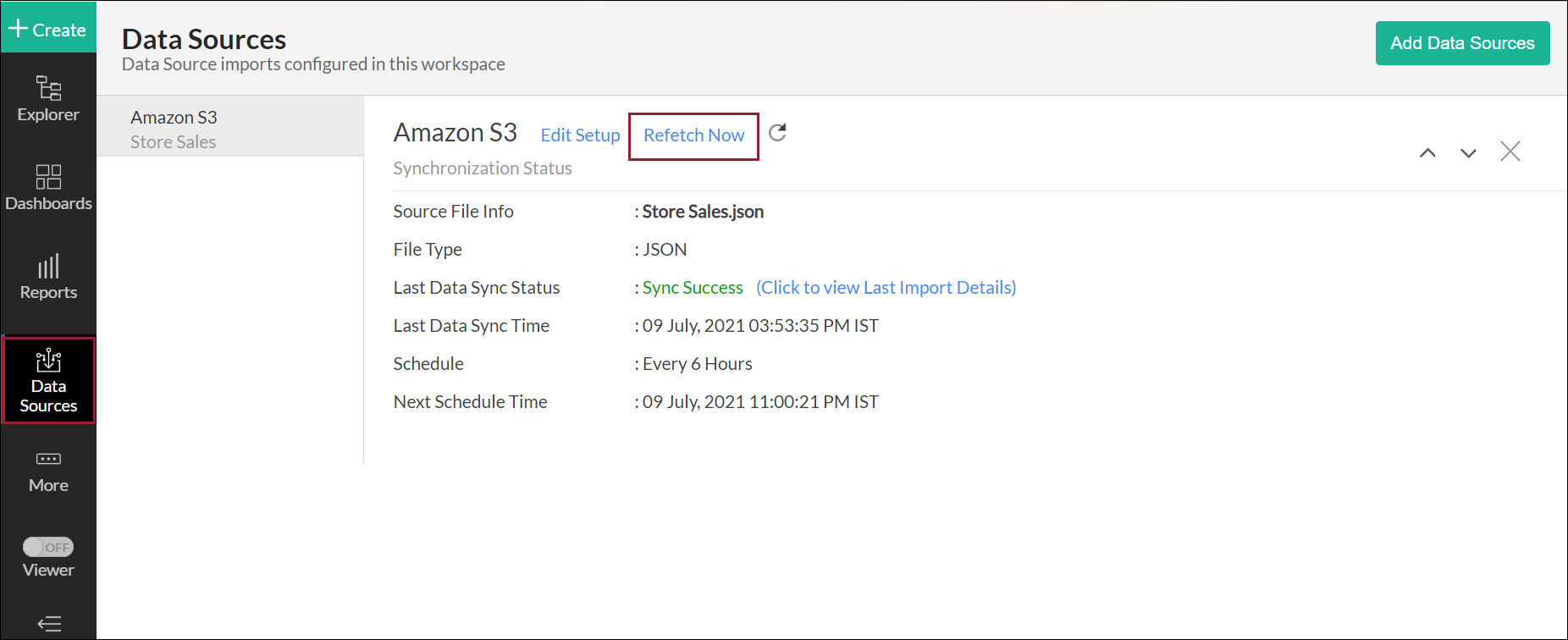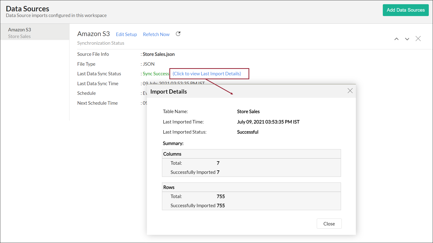 After setup, you might have to wait sometime for the initial fetch to happen. This depends upon the amount of data being imported, and also the response time of your Amazon S3 server. You will receive an email notification once the import is complete. If the workspace is accessed before the initial fetch, it will not display any data.
