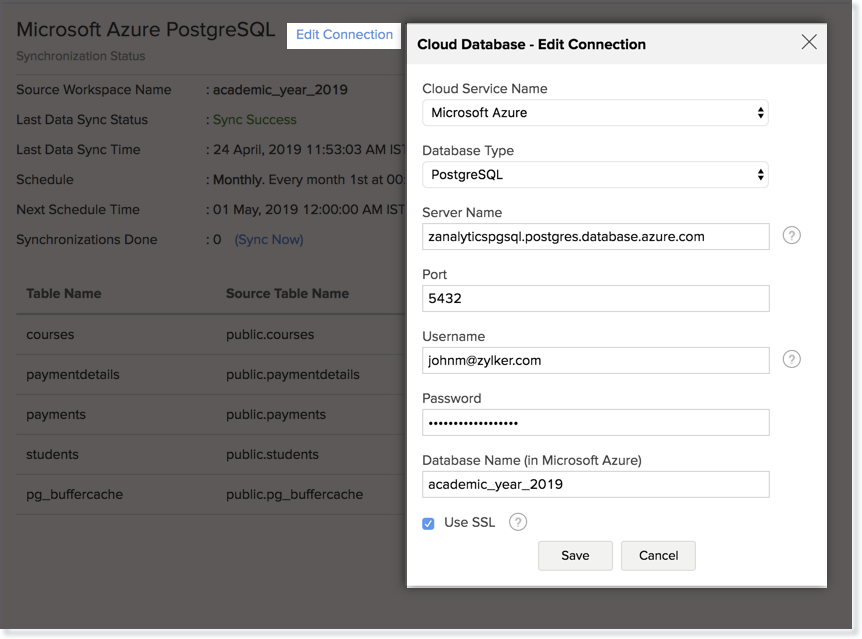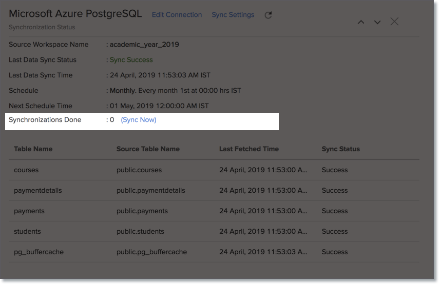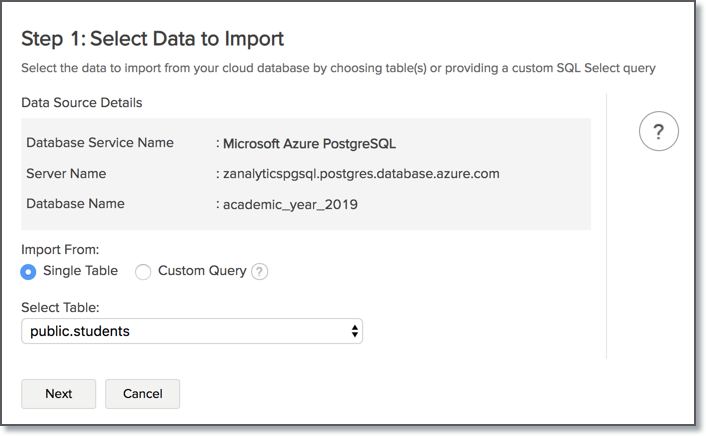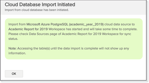 After setup, you might have to wait sometime for the initial fetch to happen. This depends upon the amount of data to be imported into Zoho Analytics and also the response time of your Microsoft Azure PostgreSQL server. You will receive an email notification once the import is complete. Please note that, if you access the workspace before the initial fetch, it will not display any data.