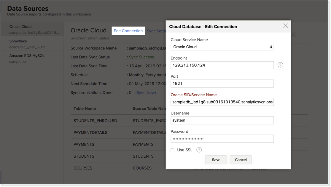 So, ensure that the tables/columns in Zoho Analytics workspace and Oracle Cloud database matches. The tables/columns that do not match will be listed in the Mismatch tab of the Oracle Cloud ConnectionSettings page. Refer the next question to know more about mismatch.