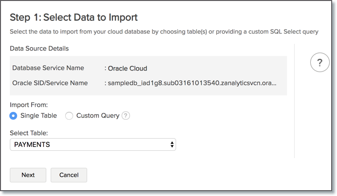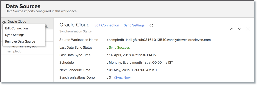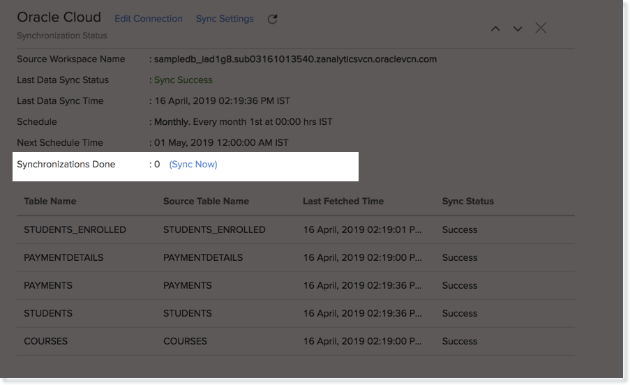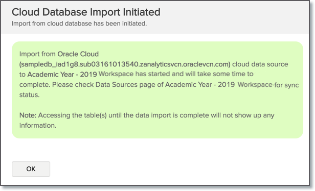 After setup, you might have to wait sometime for the initial fetch to happen. This depends upon the amount of data to be imported into Zoho Analytics and also the response time of your Oracle Cloud server. You will receive an email notification once the import is complete. Please note that, if you access the workspace before the initial fetch, it will not display any data.