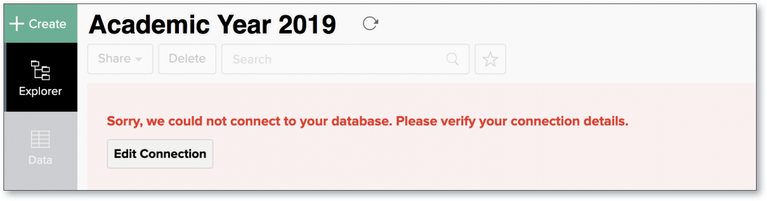 When you delete or rename a database in Oracle Cloud, Zoho Analytics loses its connectivity with Oracle Cloud. Thereafter, a warning message, as shown below, would be displayed. This error message will also be displayed if there are any connectivity issues or if your Oracle Cloud credentials have expired.