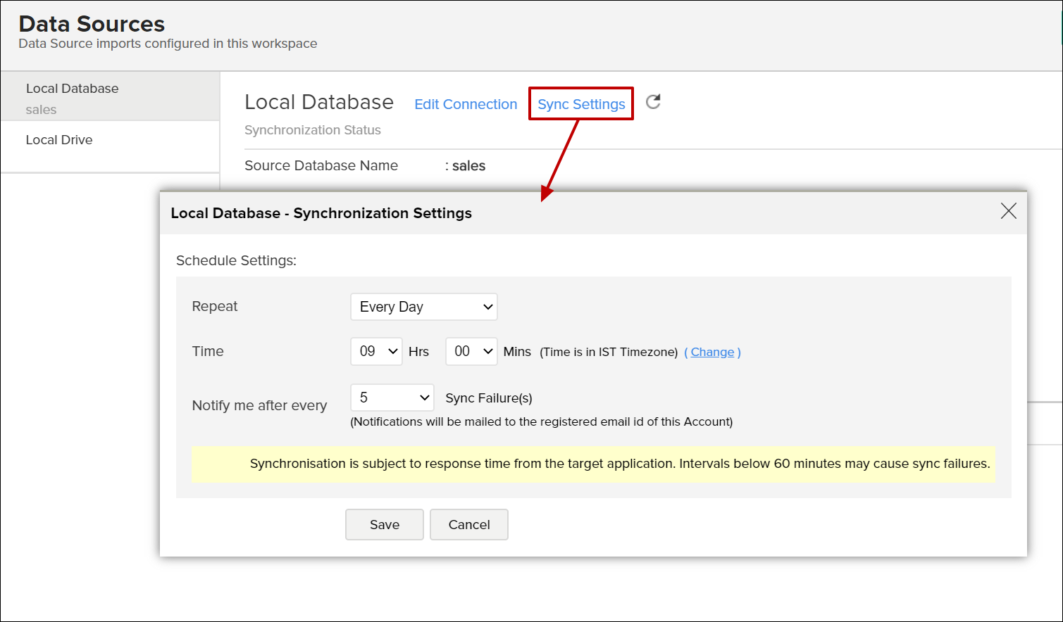 Click Save. The data from your SAP HANA database will be imported into Zoho Analytics in the specified intervals.