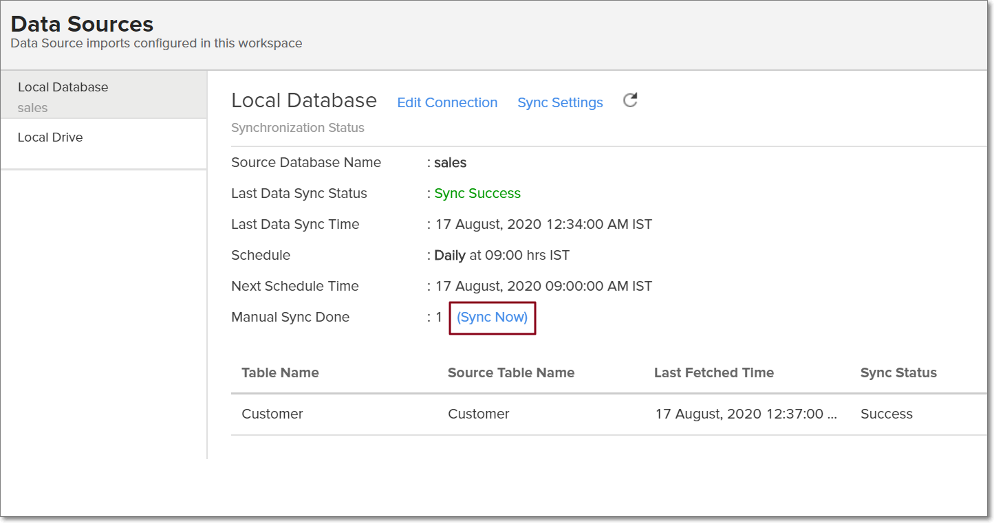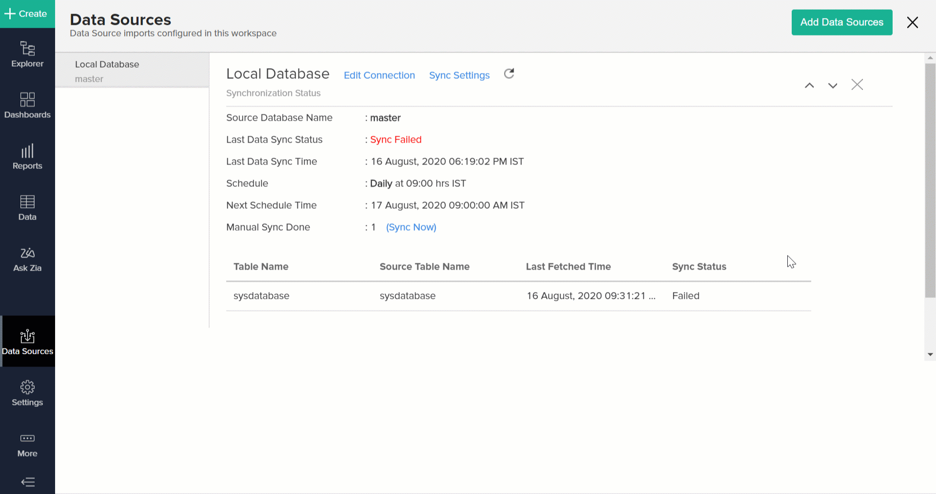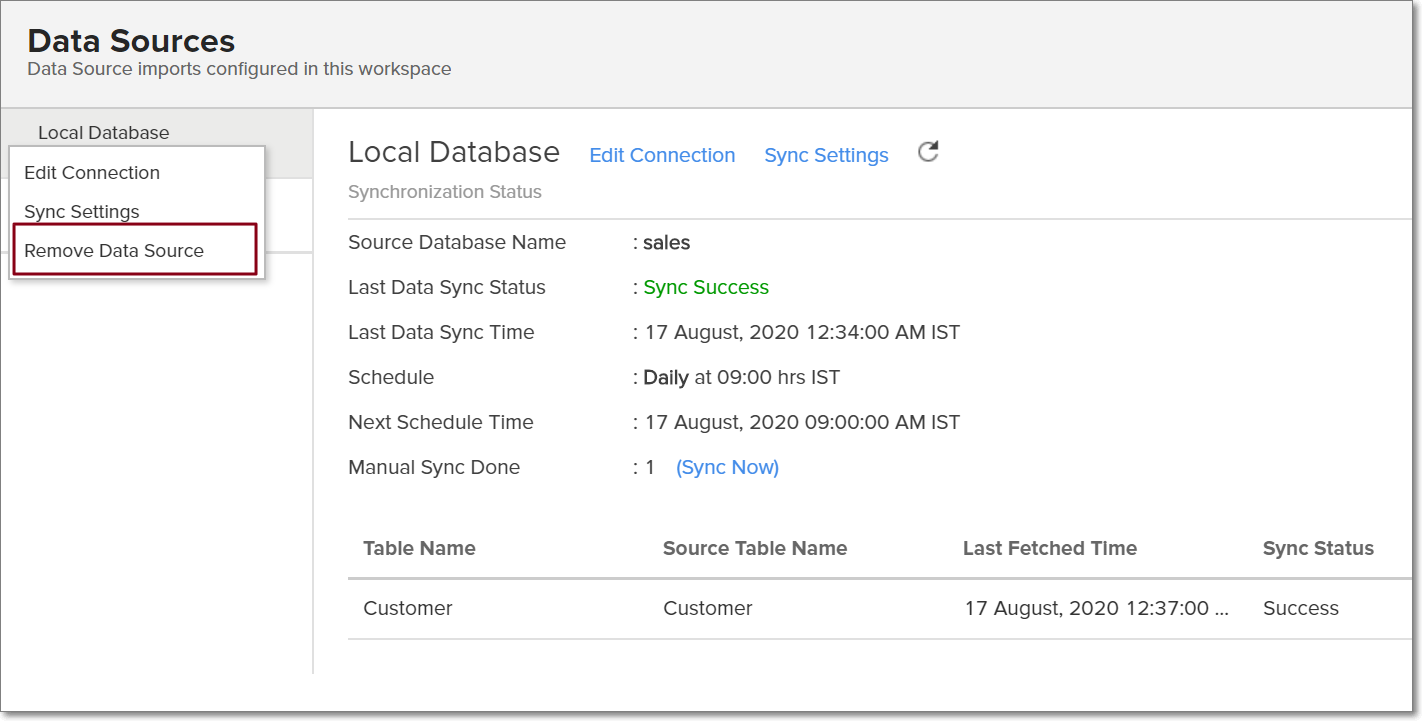 Note: Removing the data source does not delete the corresponding tables and reports from Zoho Analytics. However, further synchronization cannot be carried out.