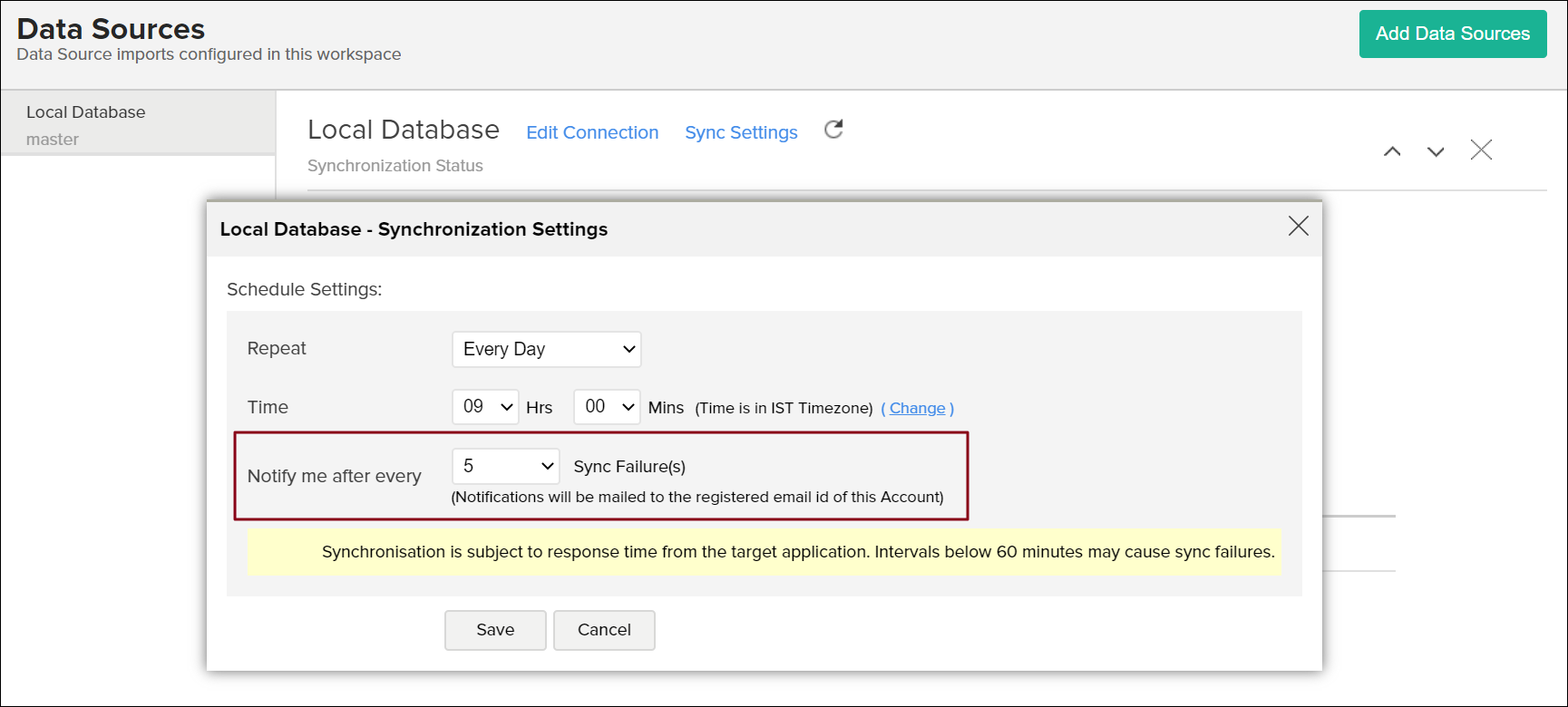 Specify the number of consecutive import failure after which you are to be notified using the Notify me after every 'N' Sync Failure (s) section.