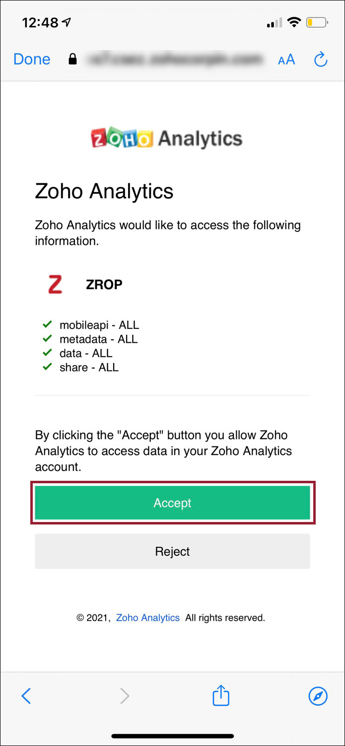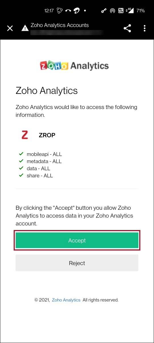 Click Accept in the page that appears to grant the app access to your Zoho Analytics data.
