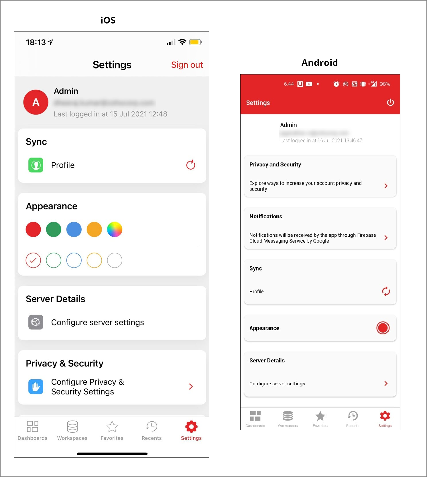The Zoho Analytics Mobile BI app displays every workspace and dashboard in your Zoho Analytics account under the corresponding sections, and also displays bookmarked views under the Favorites tab. You can also view your recently accessed visualizations and the application settings from the Recents and Settings sections respectively.
