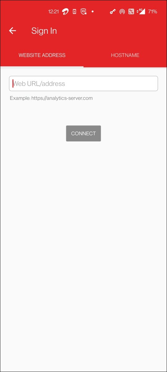 To login to Zoho Analytics account with the application's website address, click the Website address toggle button, enter the Zoho Analytics website address, and click Connect.