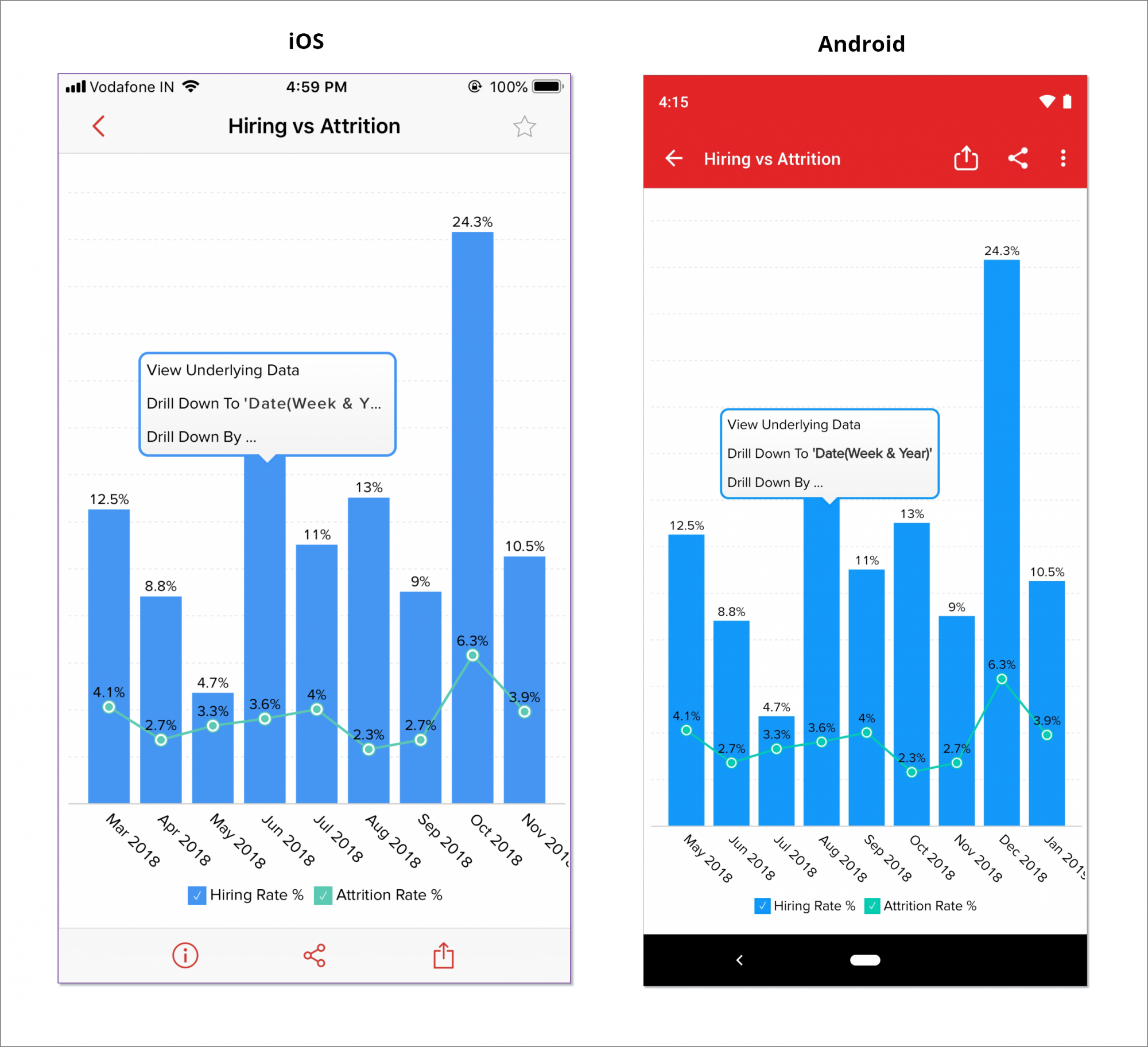 Drill Down: You can drill-down at a data point by double-tapping the required value and selecting the Drill Down option. This option is applicable only to charts.