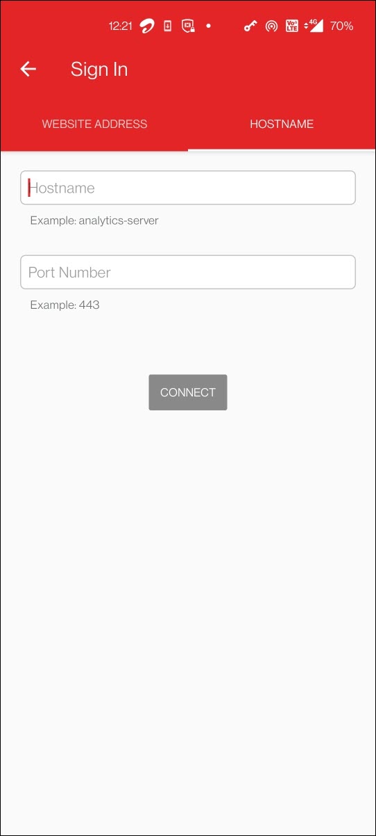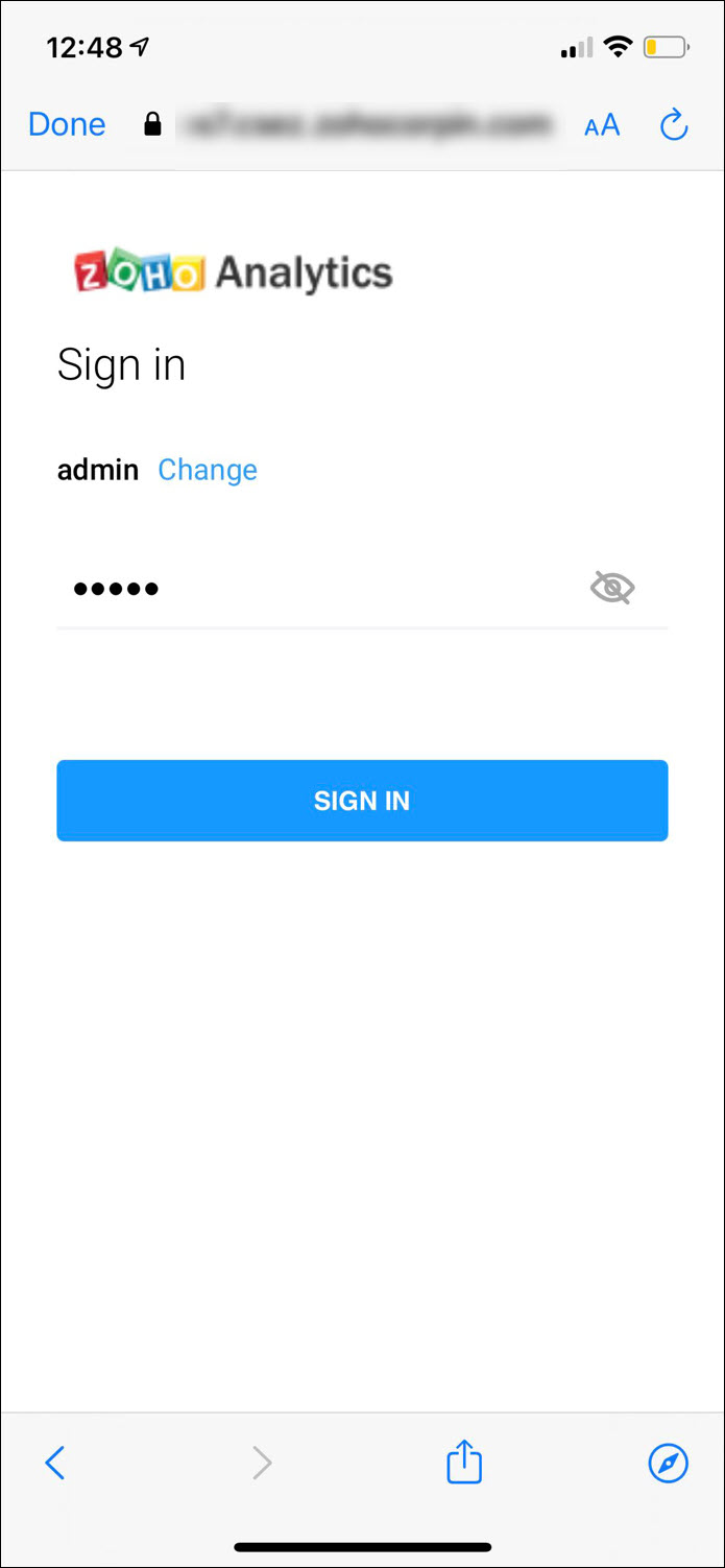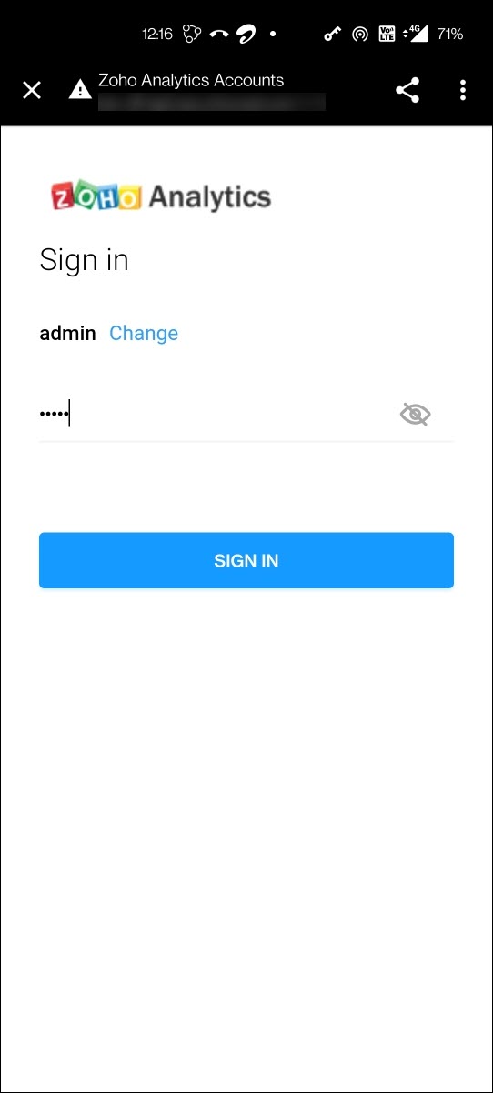 Your mobile app may issue a security warning if you're using the pre-packaged self-signed SSL certificate in the application. It is perfectly safe to bypass this security warning and access the app. Enter your Zoho Analytics username and password in the following screens, and click Sign in.