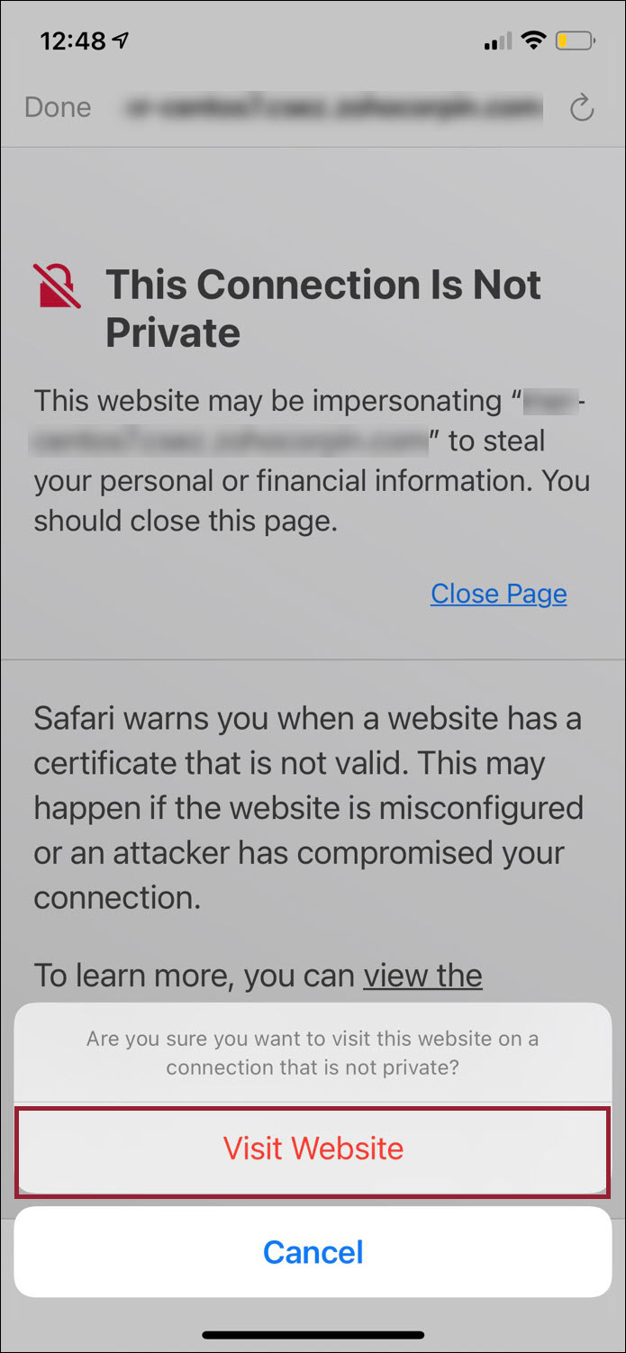 Your mobile app may issue a security warning if you're using the pre-packaged self-signed SSL certificate in your application. It is perfectly safe to bypass this security warning and access the app.