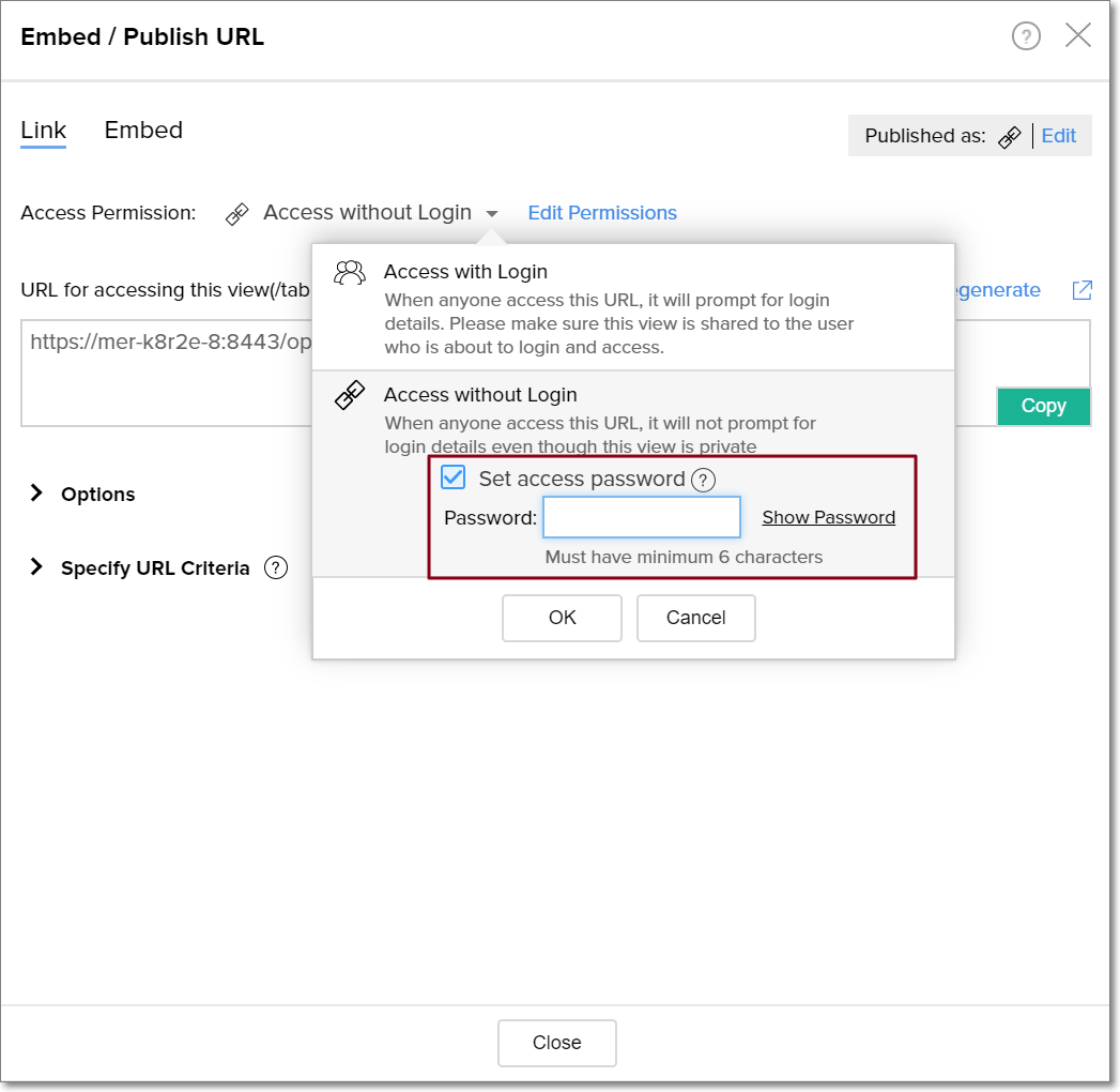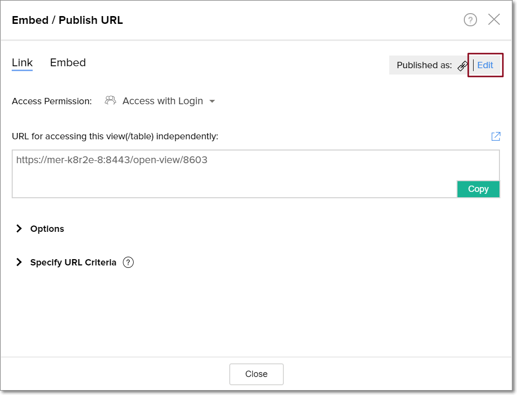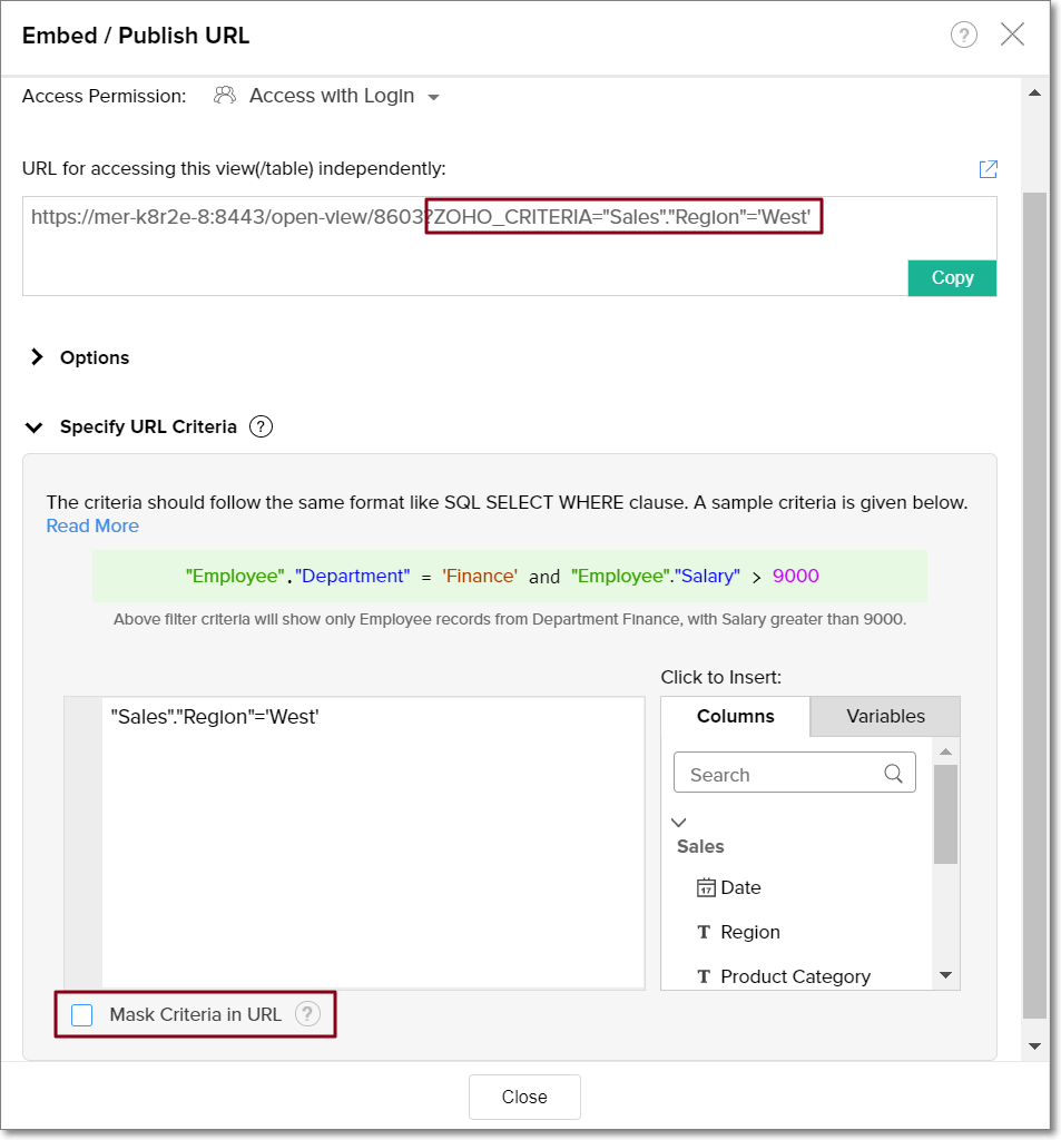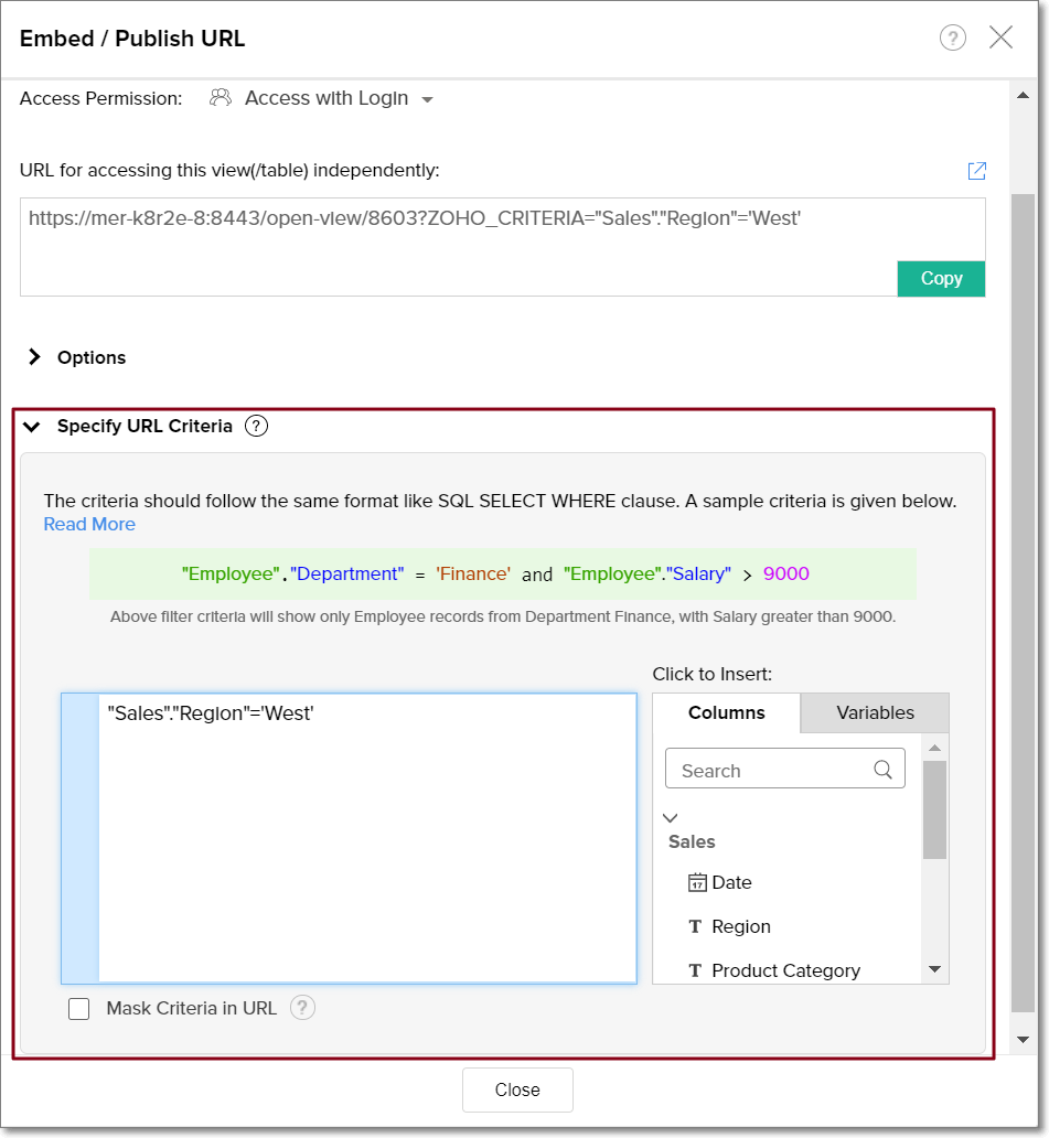 Selecting the Mask Criteria in URL checkbox hides the ZOHO_CRITERIA parameter from the embed URL. This ensures the specified filter criteria is appended to the URL, but not displayed.