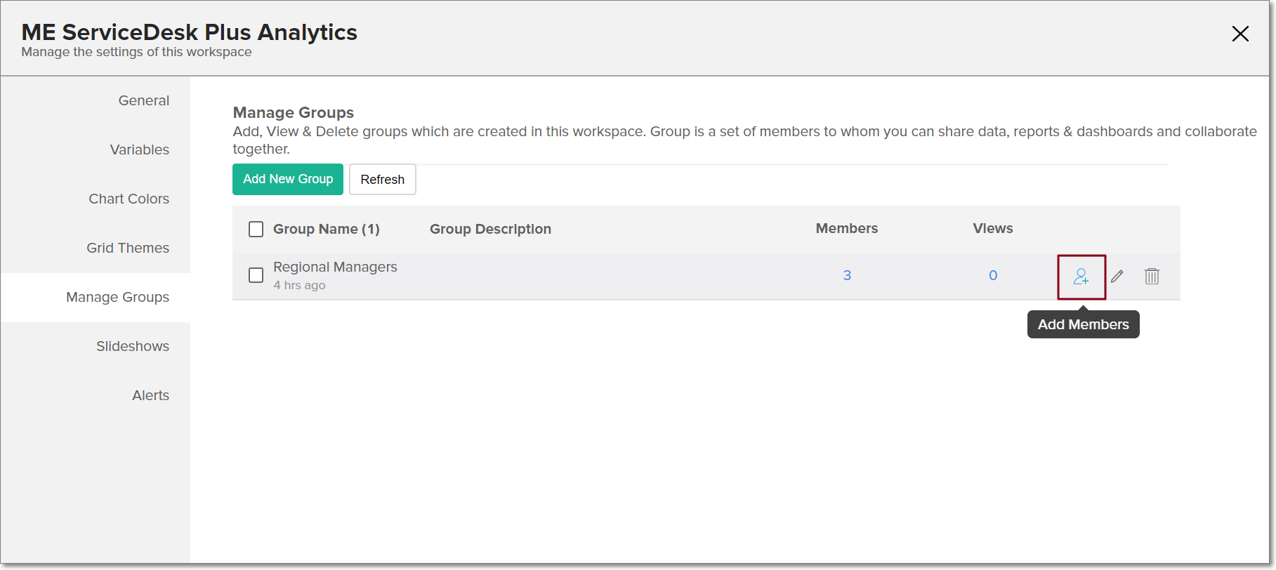 • In the Manage Groups page, navigate to the existing group and click the Add Members icon that appears on mouse over.
