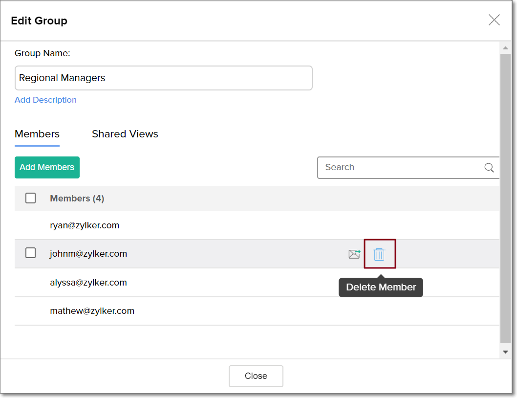 • Navigate to the Members tab, and click the Delete Member icon that appears on mouse over.