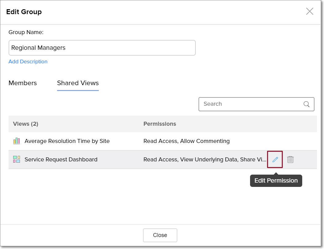 • Navigate to the Shared Views tab and click the Edit Permission icon that appears on mouse over the required shared view.