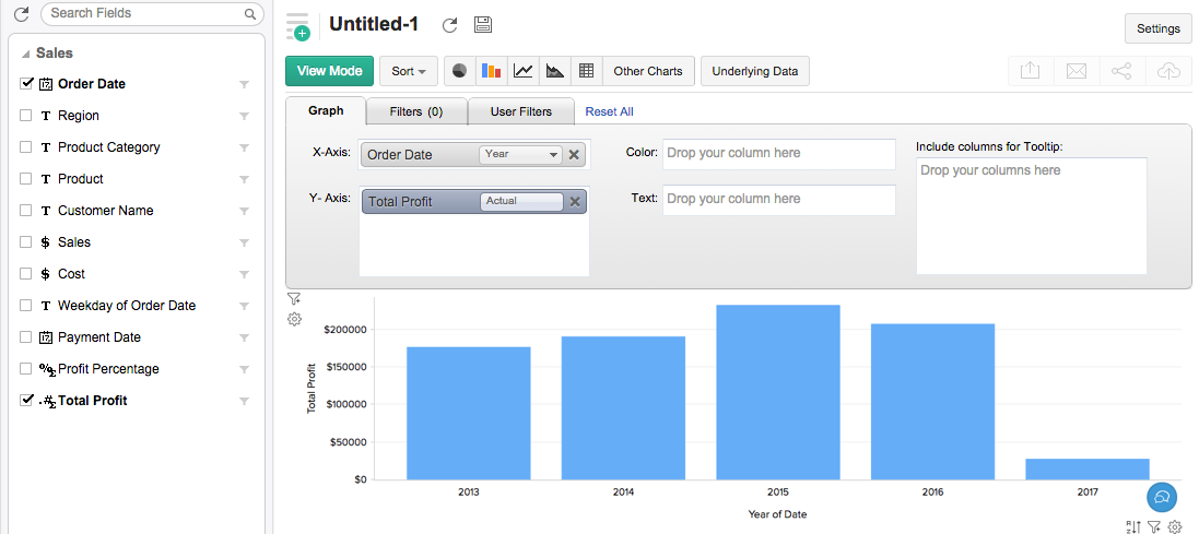 Aggregate formulas can be used in the report as you use any other data columns in the table. The value of the aggregate formula will be computed for each data point that is displayed in the report in which it is used (i.e., the result is not just a single value). In the chart shown in the screenshot below, the percentage of profit (%Profit) is plotted against the Year. As you see, the value of the Profit percentage is calculated for each year and plotted in the graph.