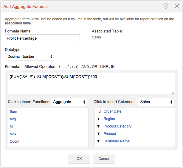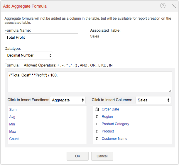 For example, Let's assume that you have already calculated profit percentage and total cost and you want to calculate total profit gained. Then you can use the existing aggregate formulas to calculate total profit gained. The formula could be something like ("Total Cost" * "Profit") / 100.