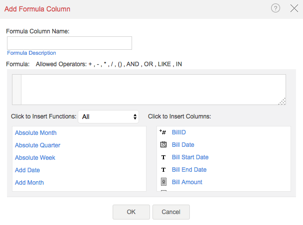 In the Formula text area provide the actual formula. You can select the columns and functions that you want to insert into the formula from the list from the Click to Insert Columns and the Click to Insert Function boxes.