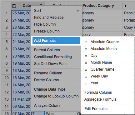 Zoho Analytics provides an easy and convenient way to add formula columns which are based on a limited set of widely used functions. You can find this quick add option as follow.